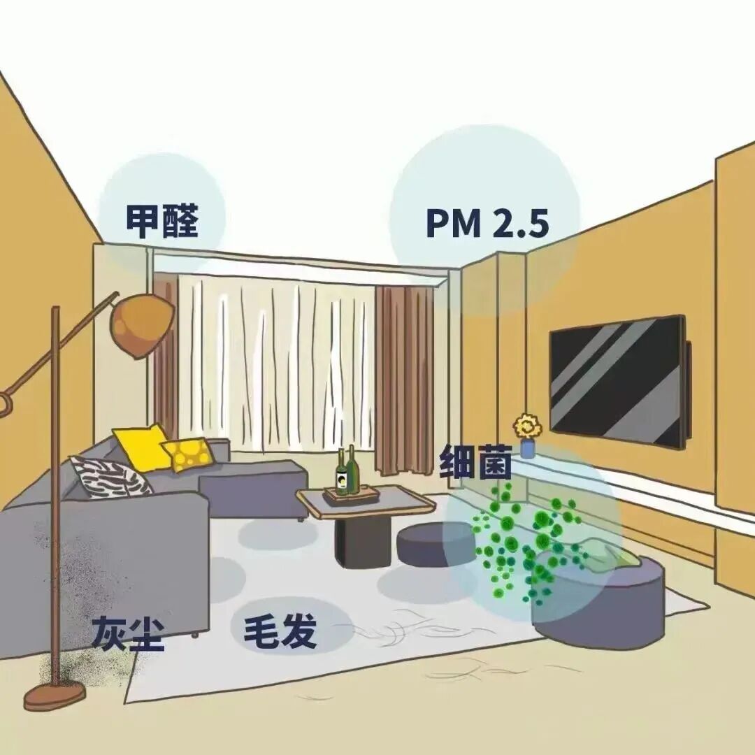 室内空气污染物的来源广泛,主要有甲醛、氨、苯系物、氡、细颗粒物、尘螨、霉菌等,还有人为制造的二手烟、油烟中的致癌物,威胁人类健康。