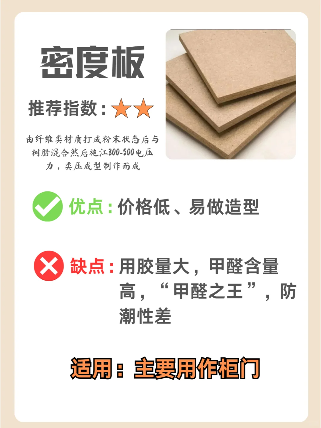 木片+木方+胶,环保,质地软,不建议做柜门