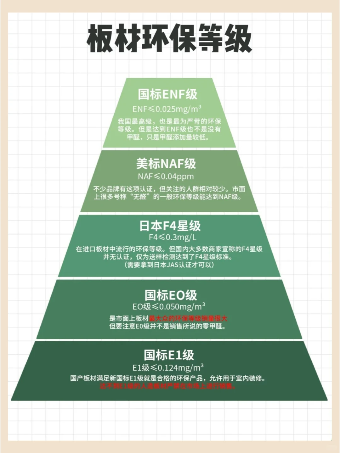 E1≤0.124mg/m³,不过这个标准不高 很容易达到。大部分国内板材厂会定自己的标准,以显示自己比国标更环保,这也是国内标准E0级的由来。