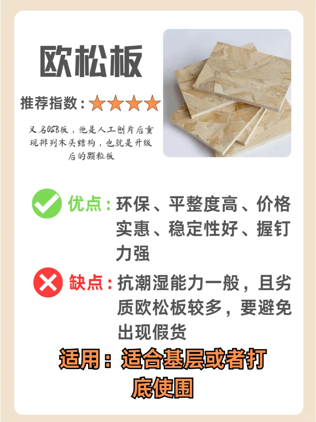 也叫定向刨花板,通过定向结构铺装,基材结构强度高、稳定性强、握钉力承重性都好,用胶量相对于颗粒板要少,比较环保。