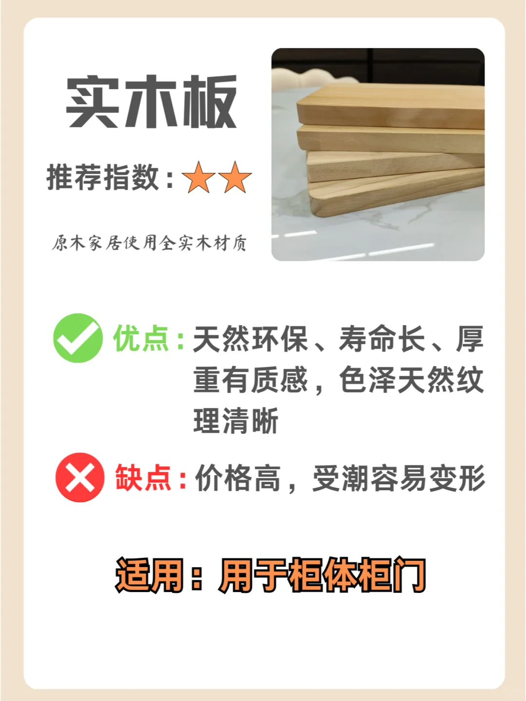 天然环保、寿命长、厚重有质感,色泽天然纹理清晰,但是价格高,受潮容易变形 可用于柜门柜体
