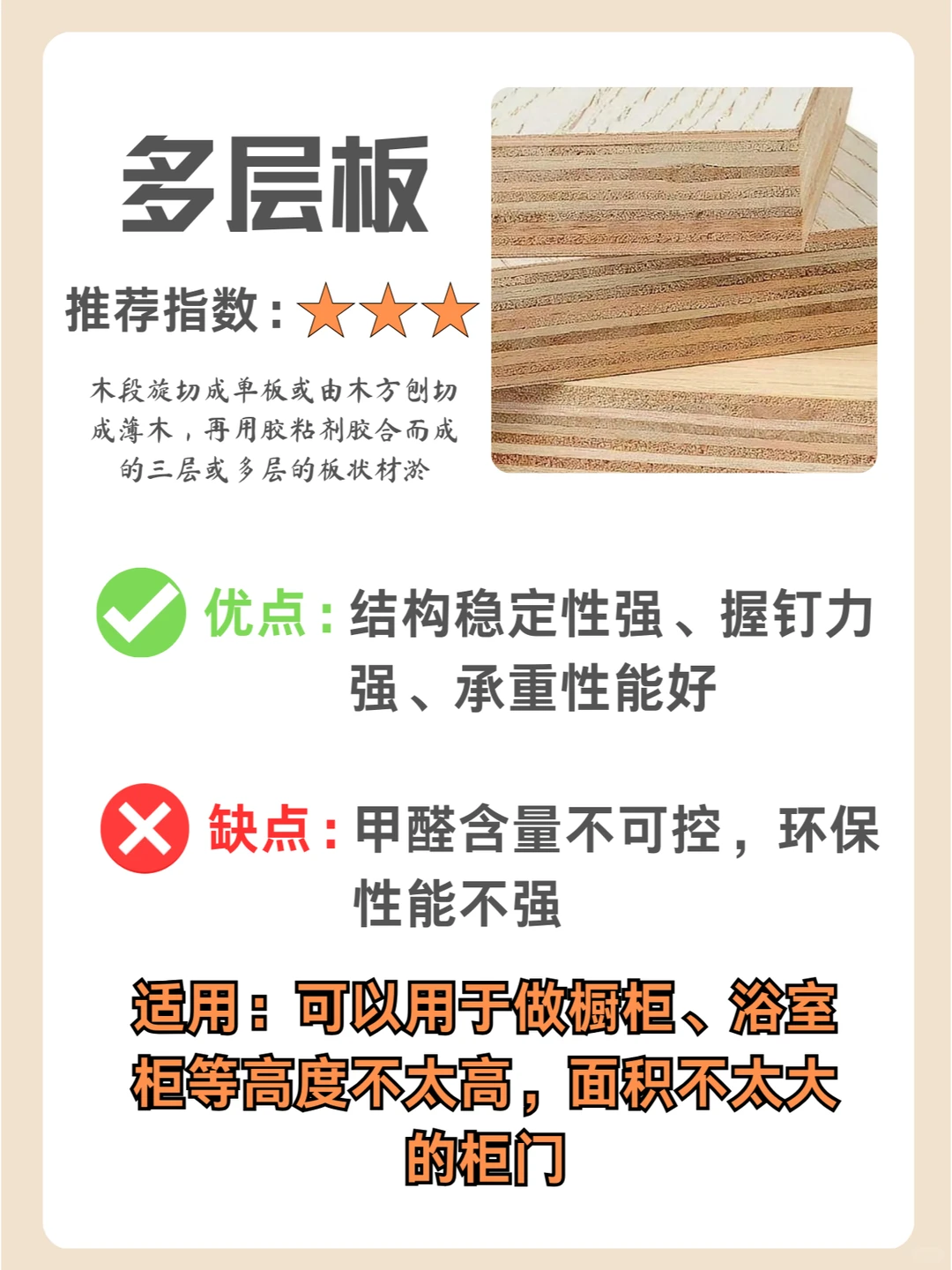 用片状薄片的木材一层层混合胶水压制而成,其结构稳定,承重性、防潮性也很好,适用于厨房的柜子,相对来说比较环保。