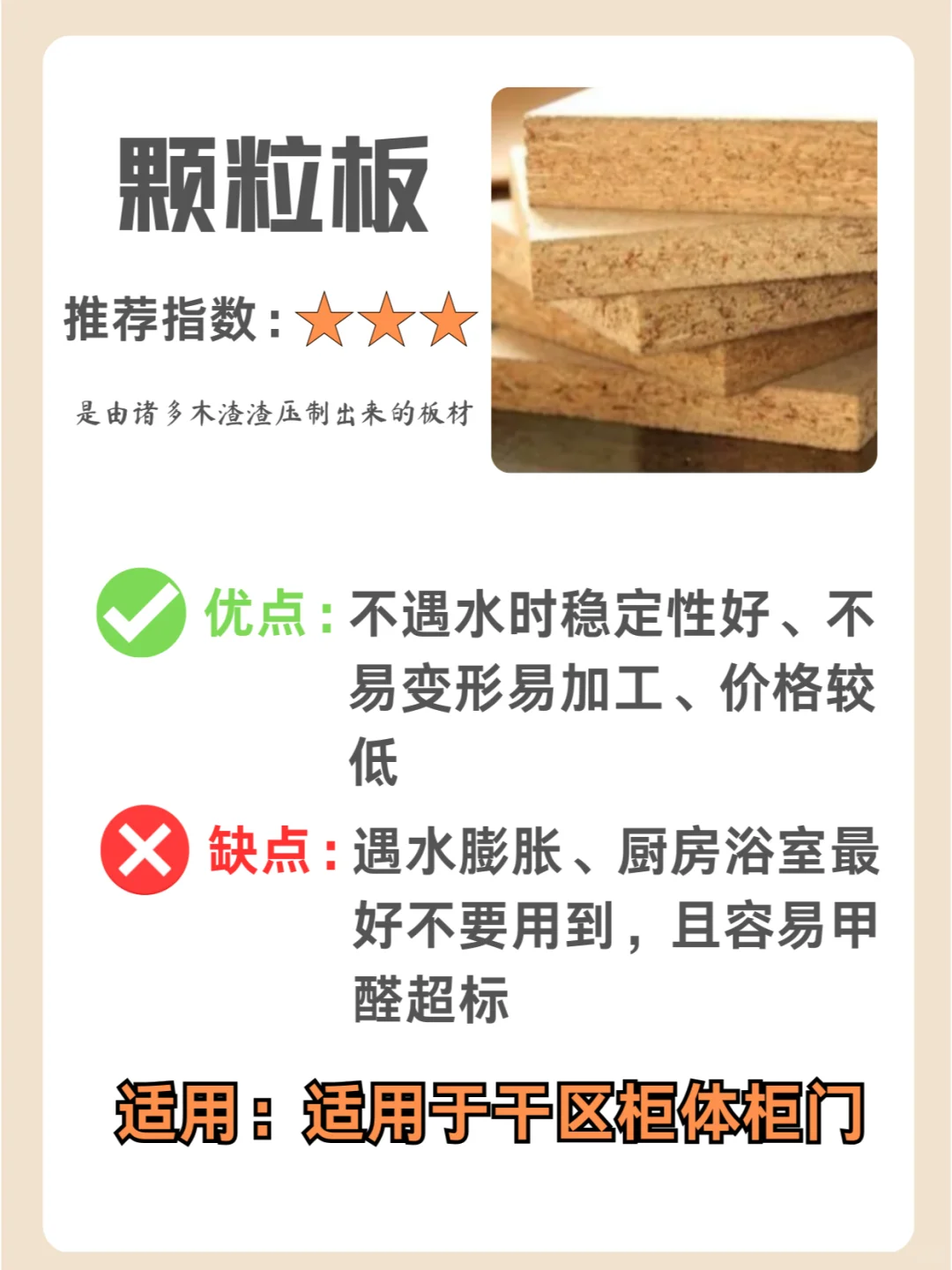实木碎屑施加胶粘剂后在热力和压力作用下胶合成的人造板缺点:实木颗粒板平整度不如密度板,做弧度和造型比较难。大家可以看到颗粒板用胶最多,所以含甲醛量也非常高,虽说外面会压模且能达到环保条件,但配上五金以后,甲醛还是会常年释放。