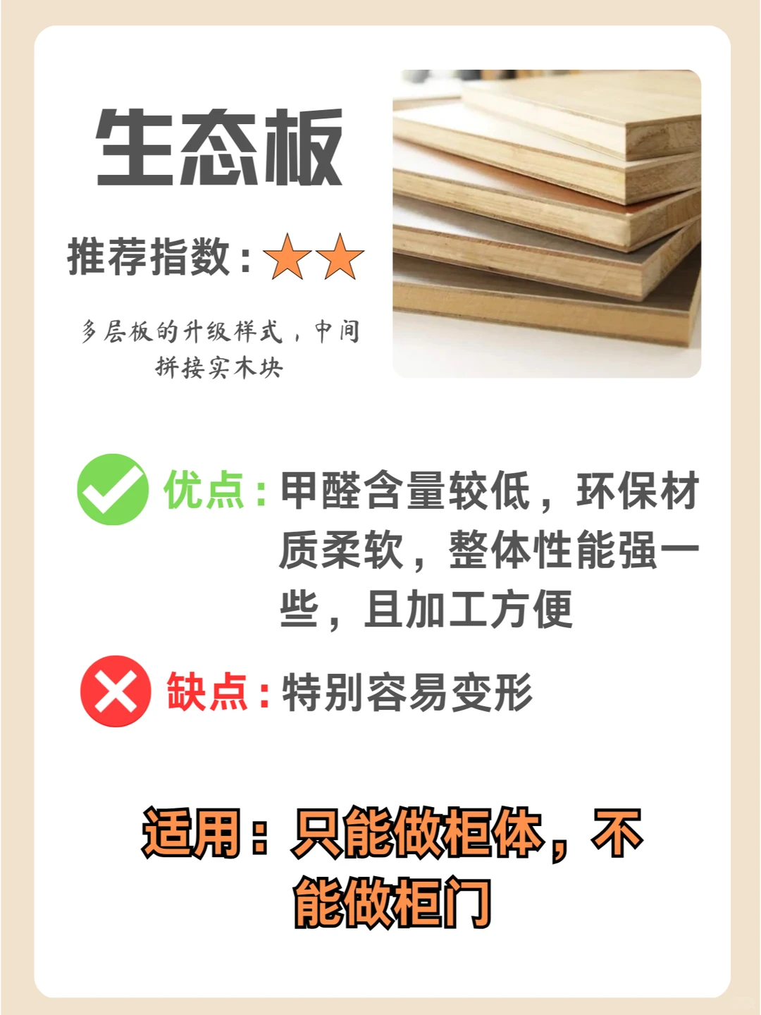 木片+木方+胶,环保,质地软,不建议做柜门